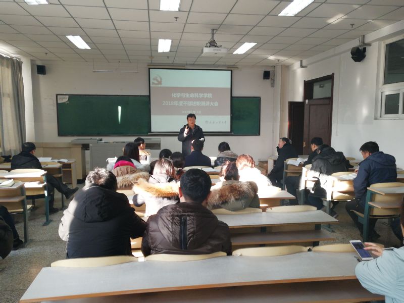 本网讯(通讯员 鞠鹏)1月11日上午,化学与生命科学学院在南湖校区科研楼104召开2018年度处级干部述职大会。大会由书记于洪主持,学院领导班子成员、全体教师参加,化学工程学院书记刘喜明出席并监督干部民主测评。