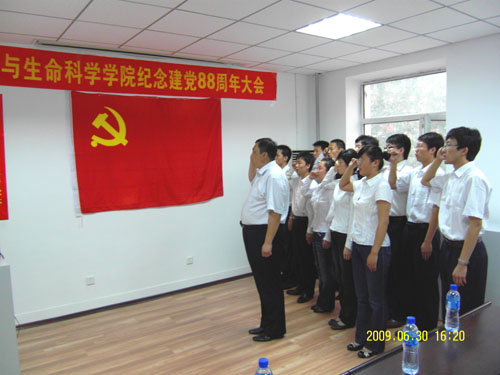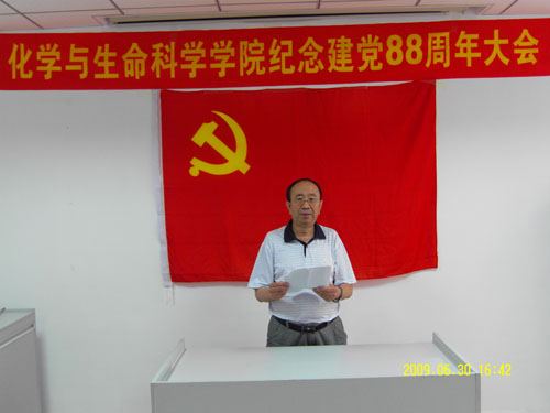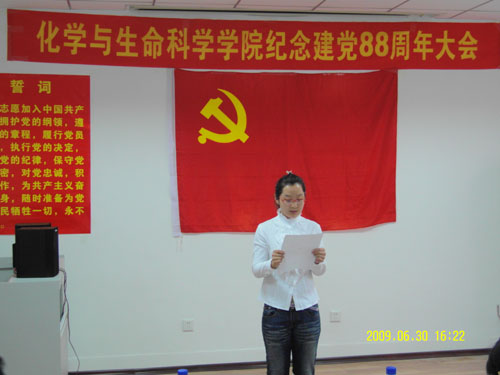 杨海彬书记代表化学与生命科学学院党委发表了热情洋溢的讲话。讲话中,杨书记首先向全体党员致以节日的问候,并向刚刚加入党组织的11名新同志表示热烈祝贺。在带领全体党员回顾党88年来走过的光辉历程之后,他强调,今年是学校的文化年,是我校发展的一个关键时期,新的形势和新的任务对我们每一位共产党员提出了更高的标准和要求。并要求广大党员要向先进典型学习,不断提高党的建设工作水平,充分发挥基层党组织的战斗堡垒作用、领导干部的模范带头作用、共产党员的先锋模范作用。