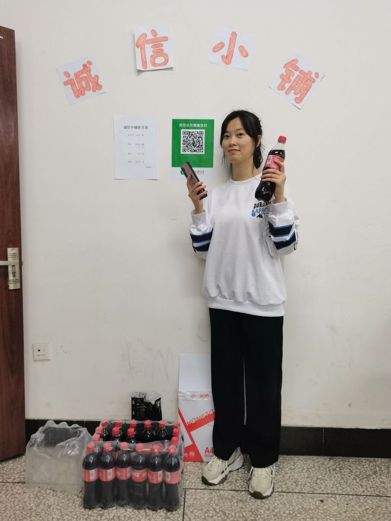 “诚信小铺”的开设极大的方便了同学们自习期间买水饮水。自习室后方陈列了矿泉水和学习用品,同学们可以通.过手机付款的方式购买自己所需要的商品。自诚信小铺开张以来,收益效果甚好,从未出现未付款就将商品带走的情况,小铺始终保持着100%的诚信率。同时小铺还准备了线上意见本,根据学生意见适当增添新商品。同学们纷纷表示小铺的建立解决了自习期间的各种不便之处,为学习生活提供了极大的便利。
