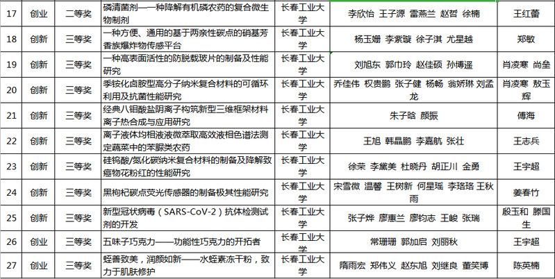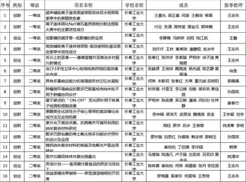 本届大赛自2019年9月启动,历时1年;覆盖全国32个省(直辖市)、自治区的302所高校3687支队伍;14000余名学生参赛;经过资格审查、网络评审、“云”答辩,共评选出学生和指导教师特等奖38项、一等奖395项、二等奖544项、三等奖674项。我校通过层层选拔,激烈的角逐,最终,由我院王志兵老师指导,王晨兆、梁正基等同学完成的《超声辅助离子液体固液萃取结合双水相萃取紫草中的萘醌类色素》项目,付壮、朱清等同学完成的《离子液体固化NaY沸石基质固相分散法提取大黄中的主要活性成分》项目,刘仟仟、王林等同学完成的《微波辅助离子液体微萃取-高效液相色谱法测定紫草中活性成分》项目荣获创新组一等奖;由王志兵老师指导,张春红等同学完成的《舌尖上的茶香——惠康蓝莓叶茶推动乡村振兴新模式》项目,以及由王鑫老师指导,李静雅等同学完成的《低聚糖防龋牙膏--低聚糖的新运用》项目荣获创业组一等奖。