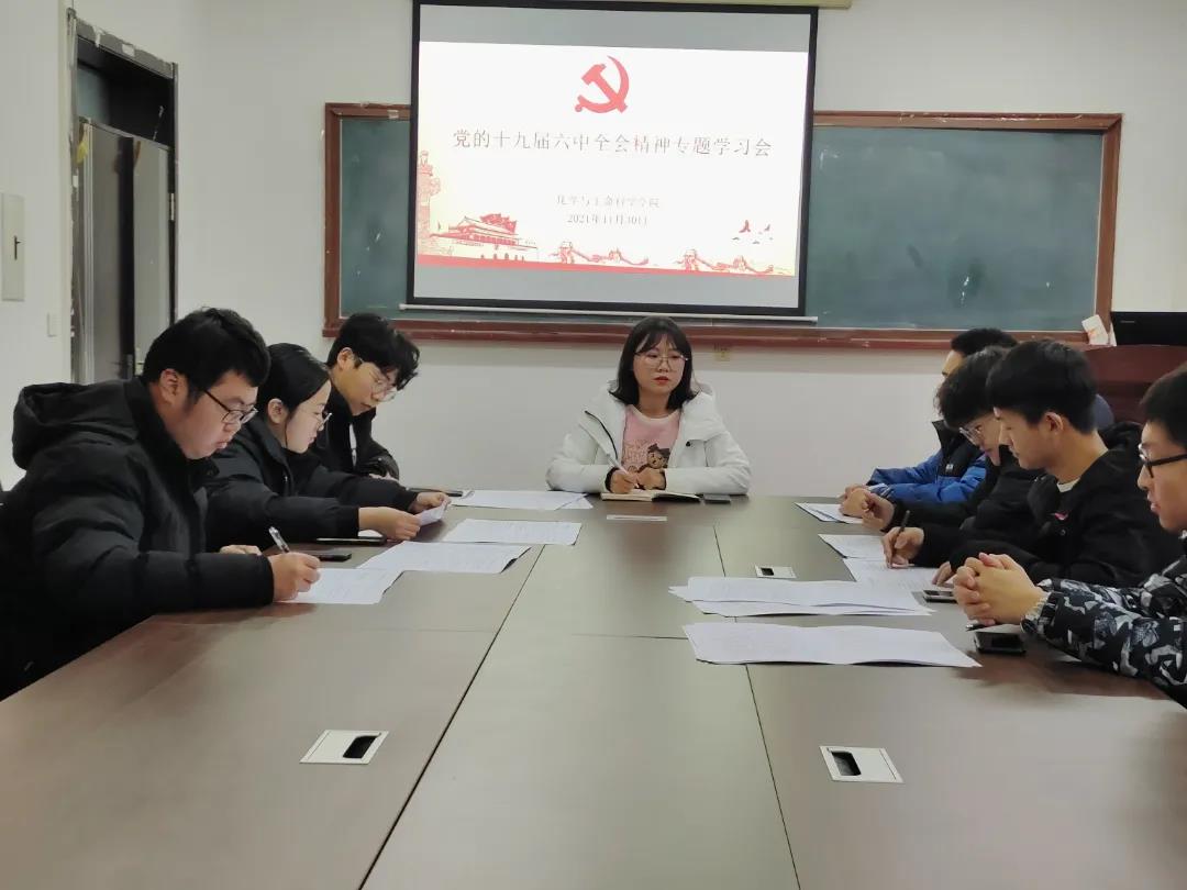 为深入学习宣传党的十九届六中全会精神,发挥学院青马学员朋辈带动作用,引导学院团员青年学习了解中央精神,11月30日,学院于南湖校区材料楼305会议室召开党的十九届六中全会精神专题学习会,辅导员侯天放带领青马学员进行了学习。