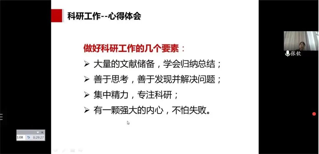 会议中,张钦老师结合自身经历具体地向大家介绍了自己的求学与科研之路,循循善诱,字字恳切。同时还告诫同学们,生活要有方向,要提前做好准备,擅于把握事物的侧重点;面对困难时要充满信念、坚定信心,找方法找窍门;对英语的学习更是不可或缺的;坚持运动,拥有一个健康的体魄。最后张钦老师表示自己对母校时刻充满着敬畏之心,感激之情。