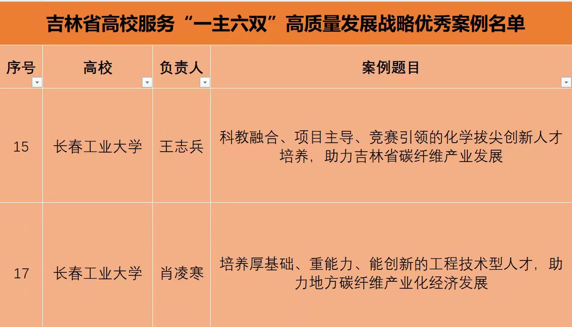 近日,吉林省教育厅印发了《关于公布高校服务“一主六双”高质量发展战略优秀案例评选结果的通知》(吉教高〔2023〕17 号),我院王志兵申报的“科教融合、项目主导、竞赛引领的化学拔尖创新人才培养,助力吉林省碳纤维产业发展”,肖凌寒申报的“培养厚基础、重能力、能创新的工程技术型人才,助力地方碳纤维产业化经济发展”2 项案例成功入选。
