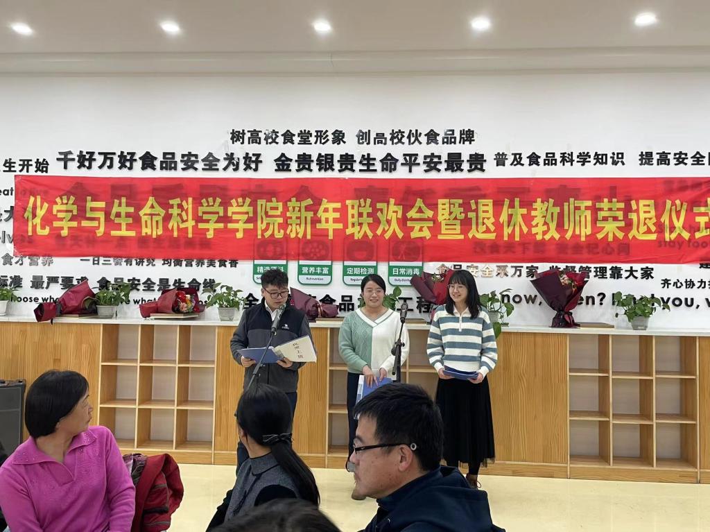 联欢会伊始,学院党委书记朱兴国深情回顾了忙碌而不平凡的2023年,与我院教职员工共同分享了过去一年所取得的喜人成绩,向我院教职工的努力奋斗和辛苦付出表示衷心的感谢。联欢会上,我院的教职工表演了丰富多彩的文艺节目,有配乐诗朗诵《脊梁》,有振奋激昂的联唱《我们走在大路上》,有温馨悠扬的小合唱《暖暖》,有的婉转轻快,有的深情款款,有的荡气回肠。此次联欢会也为老教师们举行荣退仪式。最后由我院老师带来了诗朗诵《我爱上班》。