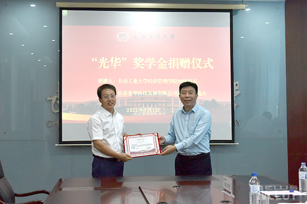 新闻网讯(通讯员 郑洪斌)在学校建校七十周年即将来临之际,我校经济管理学院90级优秀校友、长春光华科技发展有限公司总经理王逸夫捐资一百万元设立“光华”奖学金,助力我校教育事业发展。9月1日下午,学校在南湖校区主楼二楼会议室举行王逸夫校友捐赠暨客座教授聘任仪式。学校党委书记孙长智、校长张明耀热情接待王逸夫校友一行。仪式由党委副书记李东玲主持。校庆办相关人员、学校相关部门负责人、经济管理学院党政负责人参加仪式。