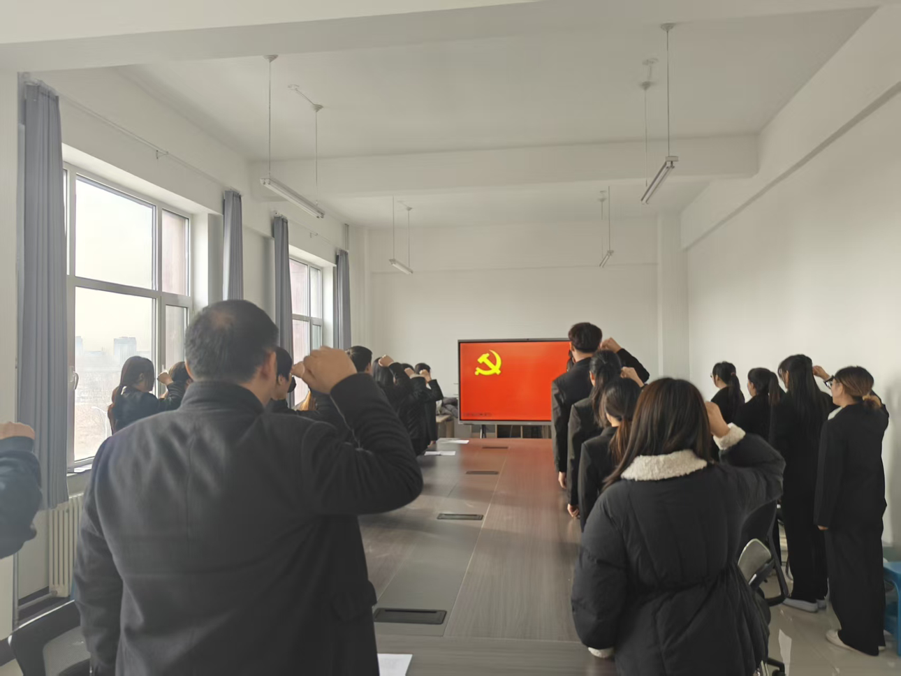 在领誓人的带领下,全体新发展党员高举右拳,面向党旗庄严宣誓。“我志愿加入中国共产党,拥护党的纲领,遵守党的章程……”铿锵有力的誓言回荡在现场,既是新党员对共产主义事业的坚定承诺,也是他们践行初心使命的郑重宣告,表达了对党的无限忠诚与为党的事业奋斗终身的决心。