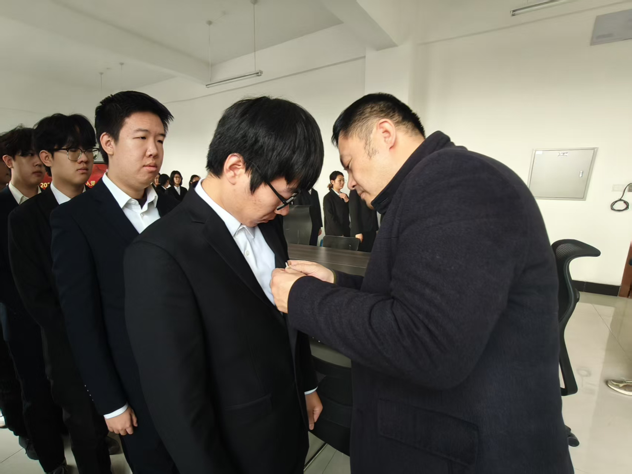 随后,佩戴党环节如期举行。党员代表郑岩书记与刘扬老师为新发展党员郑重佩戴党。熠熠生辉的党不仅是党员身份的象征,更承载着党的使命与荣光,提醒着新党员们时刻以党员标准严格要求自己,在各项工作中亮身份、树形象、作表率。