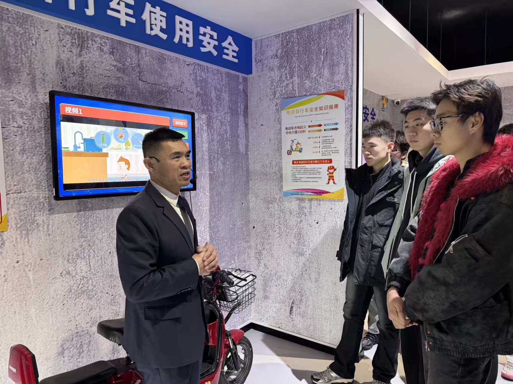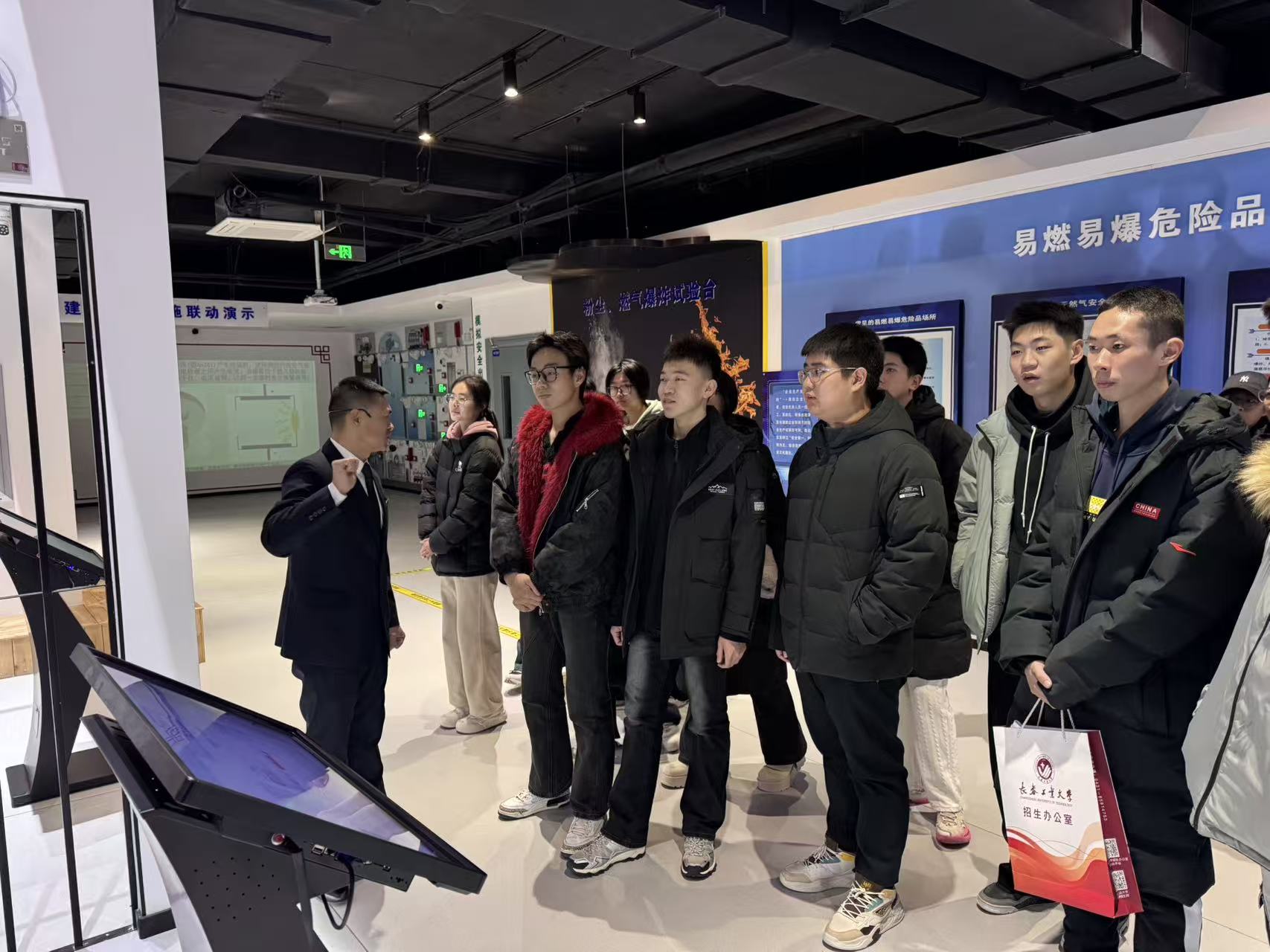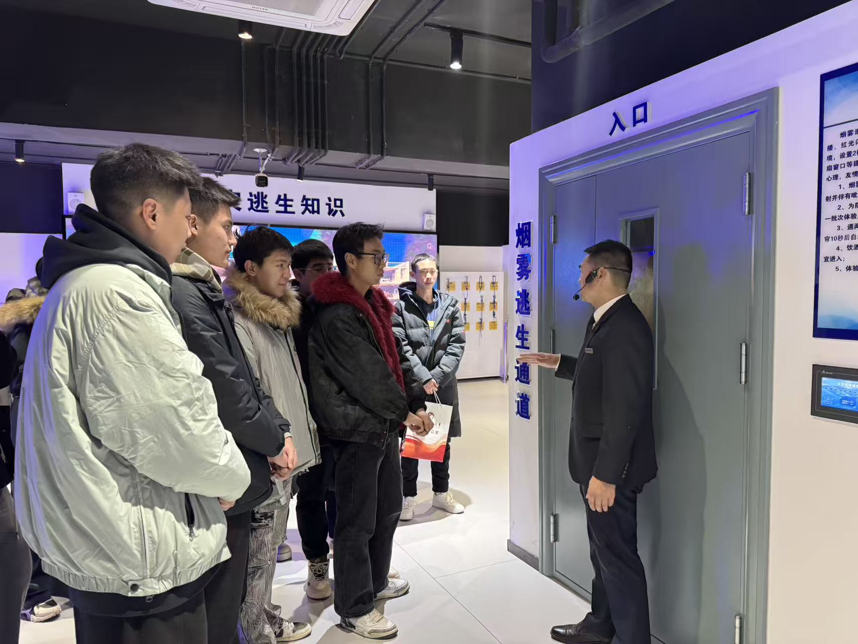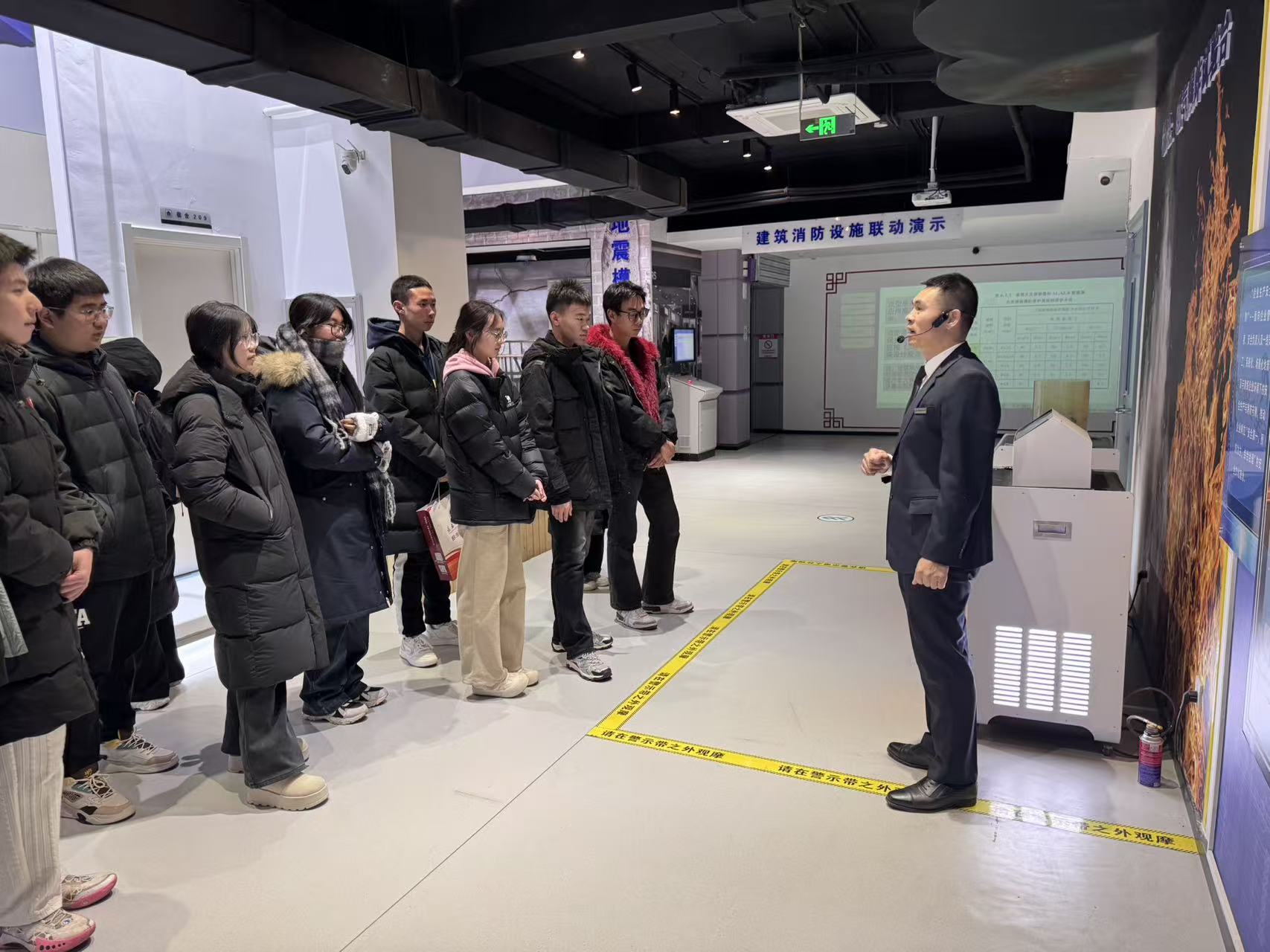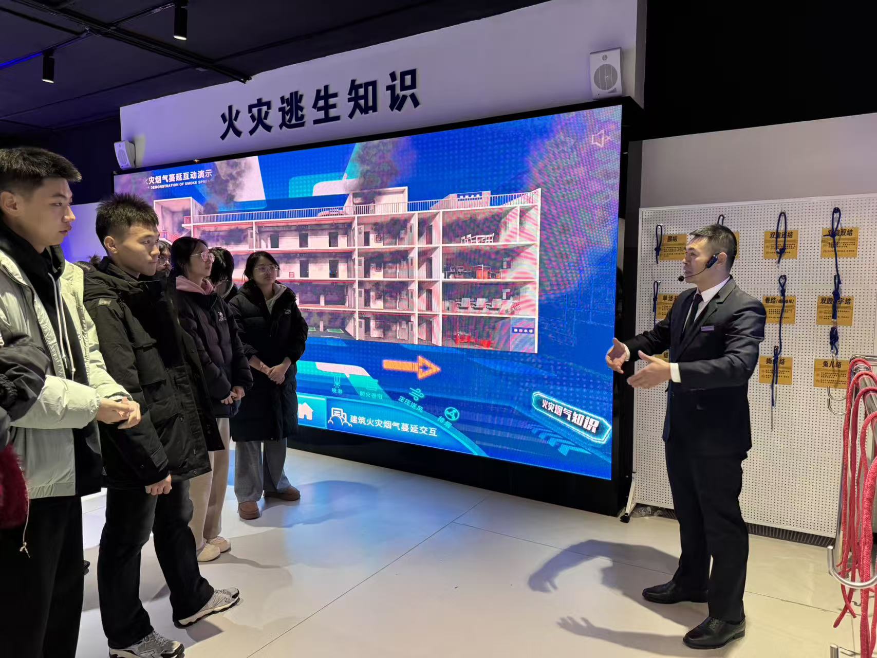 在基地讲解员的引导下,学生们依次参观了消防器材展示区、模拟体验区、安全教育展厅等多个功能区域。讲解员详细介绍了消防历史知识,现场演示了粉尘爆炸火灾,电器老化、线路私拉乱接、易燃物堆放等常见火灾隐患的识别。讲解员带领同学们观看典型火灾案例视频并纠正错误;进行高层建筑绳索逃生演练;在模拟烟雾逃生通道,学生们在昏暗环境中学习低姿匍匐、捂住口鼻等正确逃生技巧,切实提升应急反应能力。学生们系统了解了校园、实验室、宿舍等场景的火灾预防要点,以及初期火灾处置、火场自救互救等关键知识。互动体验环节中,学生们积极参与消防知识问答、体验8级地震感受,在趣味实践中深化安全认知。